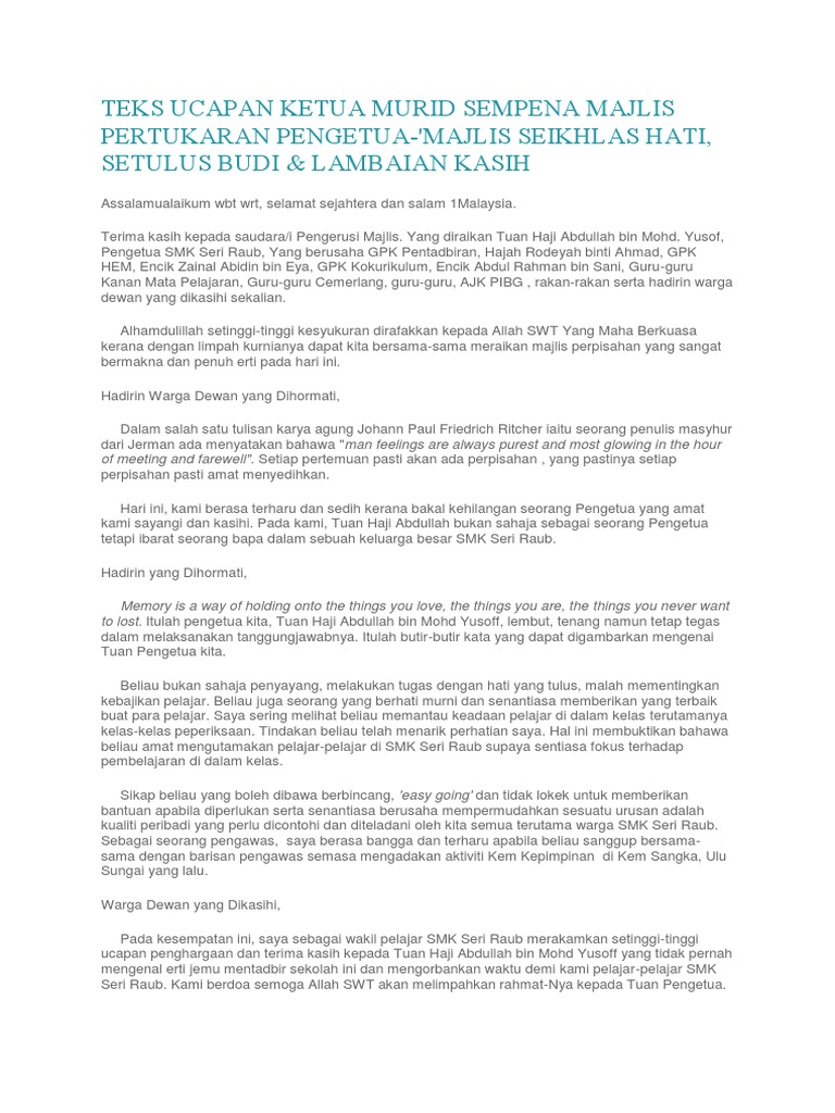 Cth Teks Ucapan Ketua Murid Sempena Majlis Pertukaran Pengetua